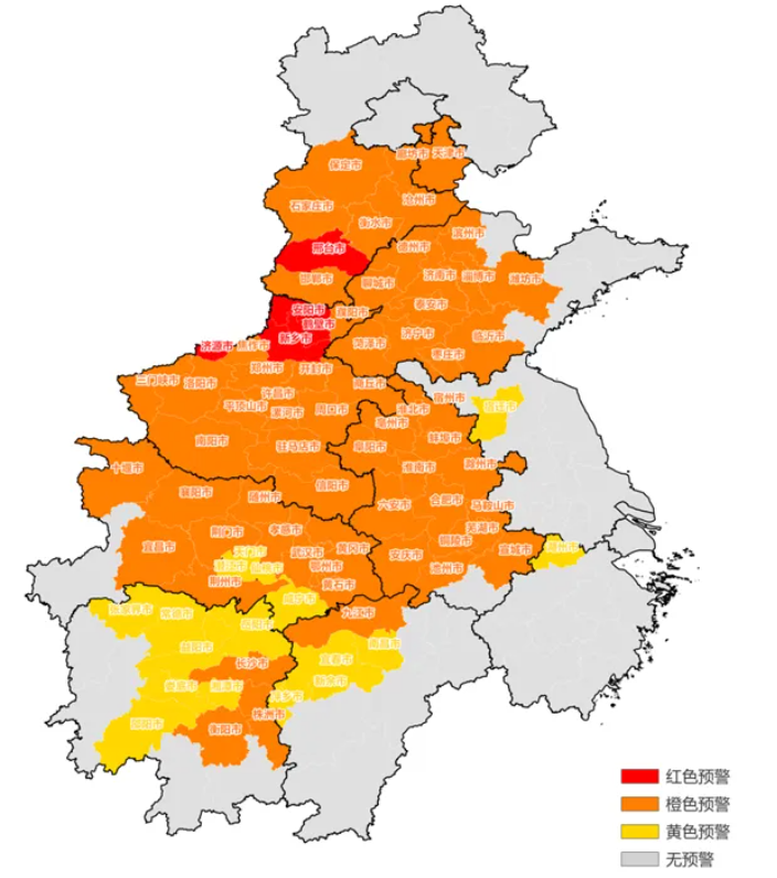其中,河南安陽、鶴壁、新鄉(xiāng)及河北邢臺啟動紅色預(yù)警(Ⅰ級),天津及河北多地啟動橙色預(yù)警,江蘇、浙江部分城市啟動黃色預(yù)警。