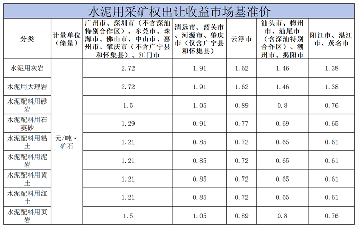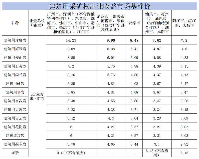 近日,廣東省自然資源廳正式印發(fā)《廣東省礦業(yè)權出讓收益市場基準價》通知,明確砂石類等礦種礦業(yè)權出讓收益的計算方式、適用范圍及區(qū)域定價標準,進一步規(guī)范砂石礦產資源出讓管理。在砂石類礦業(yè)權出讓基準價方面,廣州、深圳、東莞等珠三角九市的建筑用片麻巖價格最高,達14.23元/方;陽江、湛江、茂名建筑用凝灰?guī)r價格最低,僅2.92元/方。