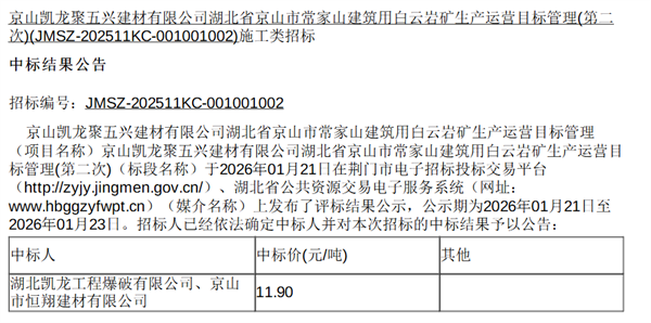 近日,中國招標(biāo)投標(biāo)公共服務(wù)平臺(tái)發(fā)布湖北省京山市常家山建筑用白云巖礦生產(chǎn)運(yùn)營目標(biāo)管理(第二次)中標(biāo)結(jié)果。由湖北凱龍工程爆破有限公司、京山市恒翔建材有限公司組成的聯(lián)合體報(bào)價(jià)11.9元/噸中標(biāo)該項(xiàng)目。