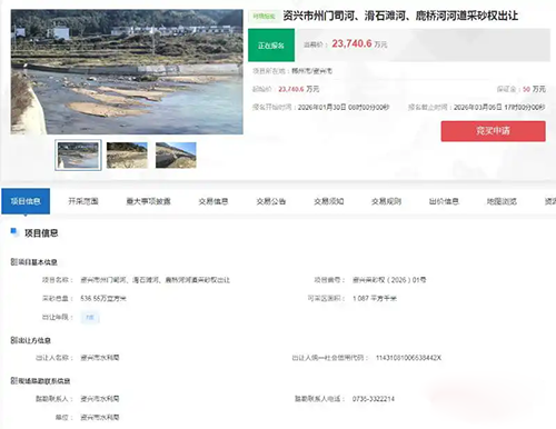 1月30日,湖南省資產(chǎn)資源交易平臺首宗采砂權(quán)交易在郴州市正式掛牌出讓,標的為資興市州門司河、滑石灘河及鹿橋河河道砂石開采經(jīng)營權(quán)。該項目可采砂石總量536.55萬立方米,經(jīng)營權(quán)期限7年,出讓起始價2.374億元。