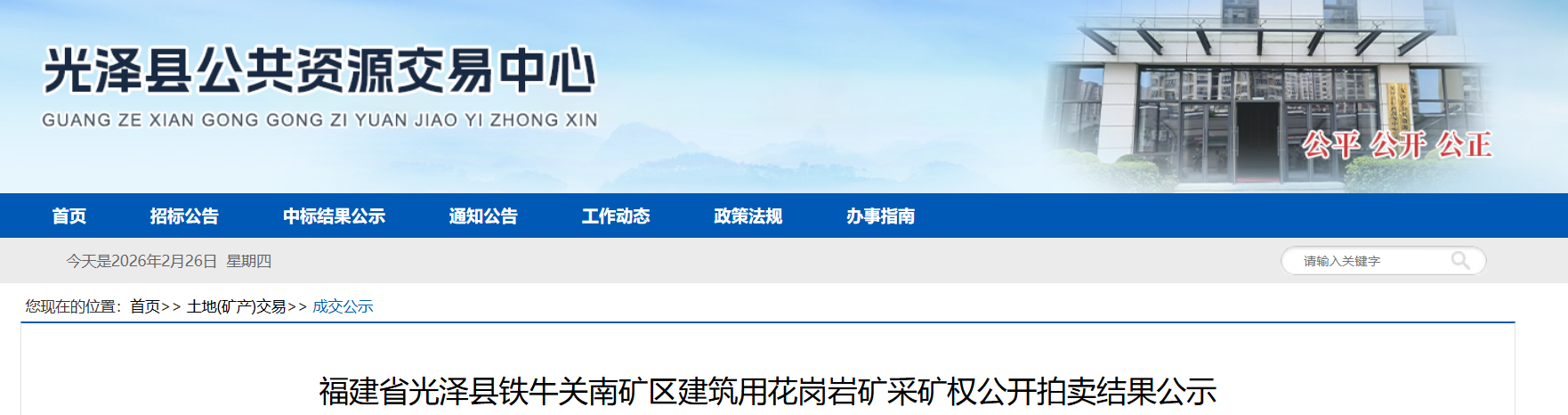 近日,福建省光澤縣光澤縣公共資源交易中心發(fā)布公告,福建省光澤縣祥彬石材有限公司競得福建省光澤縣鐵牛關(guān)南礦區(qū)建筑用花崗巖礦采礦權(quán),該礦權(quán)資源儲(chǔ)量1274.7萬方,礦權(quán)擬出讓年限20年,7732萬元成交價(jià),單價(jià)約為6元/方。