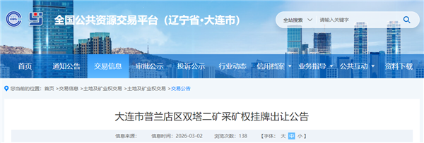 3月2日,遼寧省大連市公共資源交易平臺(tái)發(fā)布普蘭店區(qū)雙塔二礦采礦權(quán)掛牌出讓公告。該礦資源儲(chǔ)量6278萬(wàn)方,擬出讓年限23.5年,起始價(jià)約7.35億元。掛牌時(shí)間為2026年4月1日至2026年4月15日。