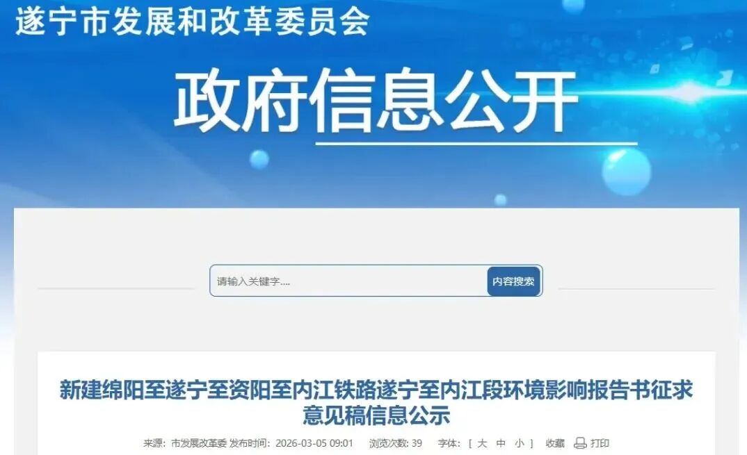 3月5日,新建綿陽至遂寧至資陽至內(nèi)江鐵路遂寧至內(nèi)江段環(huán)境影響報(bào)告書征求意見稿信息公示正式發(fā)布,項(xiàng)目環(huán)評(píng)報(bào)告即將上報(bào)四川省生態(tài)環(huán)境廳審批,初步設(shè)計(jì)批復(fù)進(jìn)入倒計(jì)時(shí)階段,有望在年內(nèi)正式開工建設(shè)。
