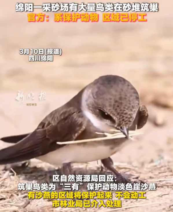 近日,有市民發(fā)現(xiàn)綿陽(yáng)部分砂石場(chǎng)有鳥(niǎo)類筑巢。政府部門迅速排查,確認(rèn)兩處筑巢點(diǎn)分別位于涪城區(qū)新皂鎮(zhèn)臨時(shí)堆沙場(chǎng)和游仙區(qū)小枧鎮(zhèn)砂石加工廠,筑巢鳥(niǎo)類為國(guó)家“三有”保護(hù)動(dòng)物——淡色崖沙燕。其中新皂鎮(zhèn)有300余個(gè)新筑巢穴,小枧鎮(zhèn)有400余個(gè)新舊巢穴,所有巢穴整體完好,無(wú)破壞痕跡。