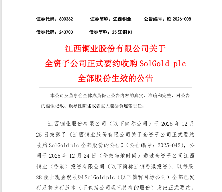 這場備受行業(yè)關(guān)注的跨境并購,始于2025年12月,前后歷時3個月,期間波折不斷。江銅最初通過全資子公司江西銅業(yè)(香港)投資有限公司發(fā)起收購要約,先后兩次以每股26便士的價格報價,均被SolGold董事會拒絕,收購進程一度陷入停滯。