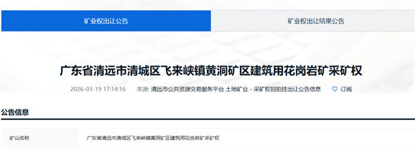 公告顯示,廣東省清遠(yuǎn)市清城區(qū)飛來(lái)峽鎮(zhèn)黃洞礦區(qū)建筑用花崗巖礦礦區(qū)面積0.5705平方千米,掛牌時(shí)間2026年4月17日9時(shí)至4月30日10時(shí)。掛牌起始價(jià)為30109.3萬(wàn)元,競(jìng)買報(bào)價(jià)增價(jià)幅度為150萬(wàn)元的整數(shù)倍,交易保證金為6030萬(wàn)元。