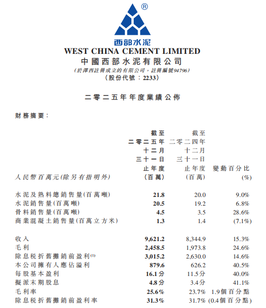 凈利潤8.8億元!西部水泥2025年砂石骨料銷售450萬噸