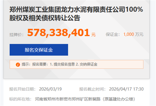日前,鄭州煤炭工業(yè)集團(tuán)龍力水泥有限責(zé)任公司100%股權(quán)及相關(guān)債權(quán)在產(chǎn)權(quán)交易平臺(tái)公開轉(zhuǎn)讓,項(xiàng)目轉(zhuǎn)讓底價(jià)5.78億元,其中100%股權(quán)轉(zhuǎn)讓底價(jià)僅為1元。