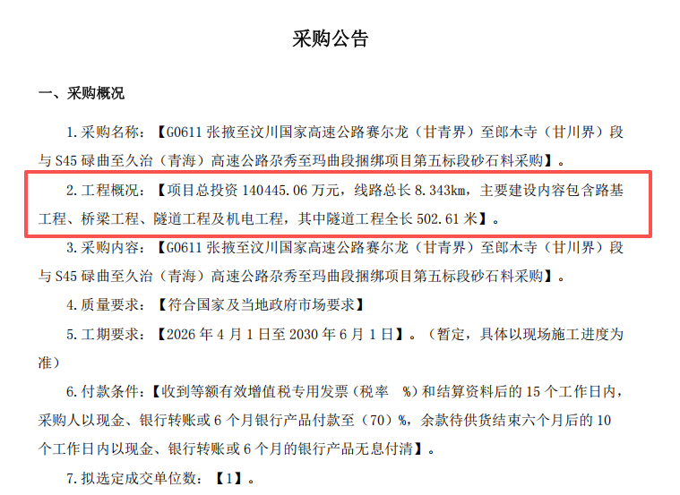 據(jù)悉,此次采購涉及的捆綁項目是西部陸海新通道走廊的關(guān)鍵組成部分,也是完善甘青高速大環(huán)線、連接甘肅、青海、四川三省的重要交通樞紐工程,對增強省際聯(lián)系、帶動沿線旅游及資源開發(fā)、助推區(qū)域經(jīng)濟發(fā)展具有重要意義。其中,第五標段項目總投資達140445.06萬元,線路總長8.343公里,主要建設內(nèi)容涵蓋路基工程、橋梁工程、隧道工程及機電工程,其中隧道工程全長502.61米,工程建設規(guī)模較大、標準較高。
