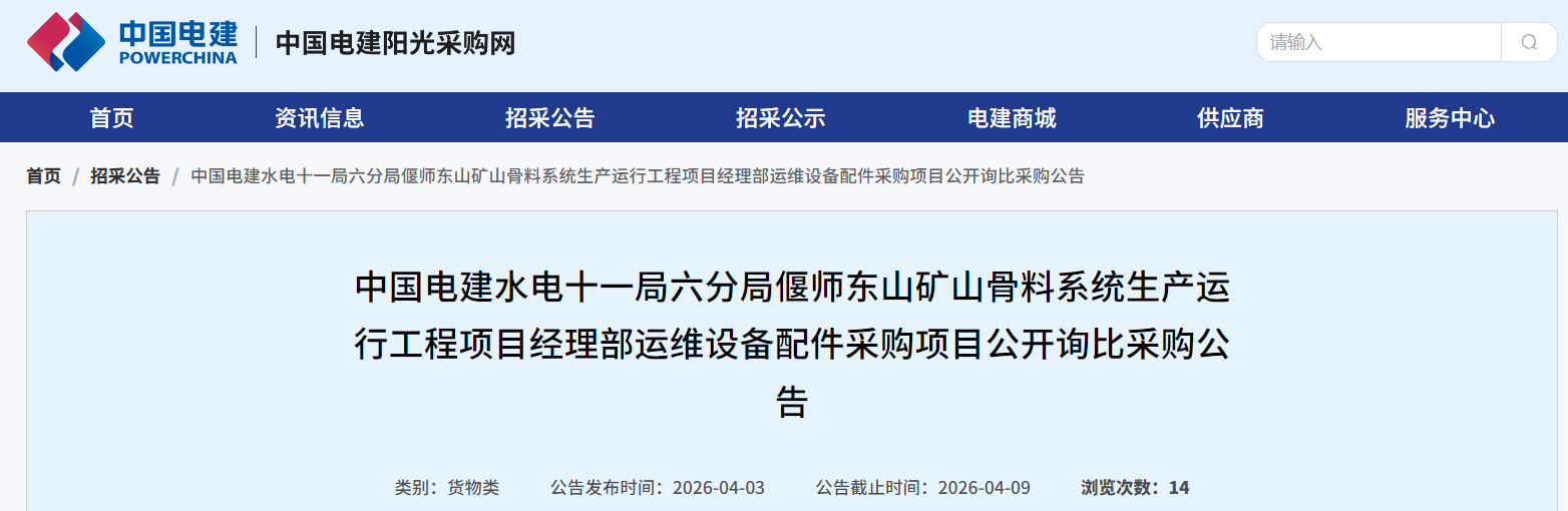 日前,中國(guó)電建陽(yáng)光采購(gòu)網(wǎng)發(fā)布中國(guó)電建水電十一局六分局偃師東山礦山骨料系統(tǒng)生產(chǎn)運(yùn)行工程項(xiàng)目經(jīng)理部運(yùn)維設(shè)備配件采購(gòu)項(xiàng)目公開詢比采購(gòu)公告。