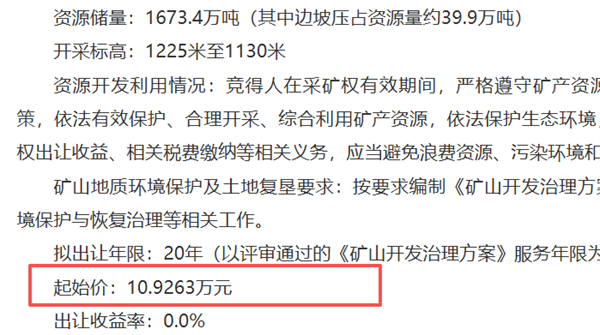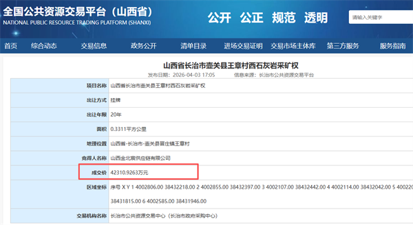 近日,從山西省長治市規(guī)劃和自然資源局獲悉,長治市壺關(guān)縣王章村西石灰?guī)r采權(quán)成功出讓。該項目掛牌起始價約10.92萬元,地方民企山西金北宸供應(yīng)鏈有限公司以4.23億元的價格競得該礦權(quán),溢價率高達(dá)387139%。