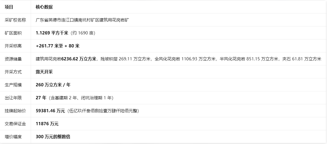 近日,清遠(yuǎn)市自然資源局發(fā)布公告,掛牌出讓英德市連江口鎮(zhèn)南坑村建筑用花崗巖礦采礦權(quán)(編號清政務(wù)礦掛出〔2026〕003號)。該礦面積1.1269平方千米,資源儲量6236.62萬立方米,采用露天開采,生產(chǎn)規(guī)模260萬立方米 / 年,出讓年限27年(含基建期2年、閉坑治理期1年),起始價59381.46萬元,交易保證金1.19億元。
