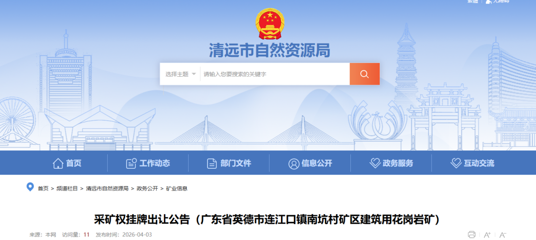 本次采礦權(quán)出讓經(jīng)清遠(yuǎn)市人民政府批準(zhǔn),由清遠(yuǎn)市自然資源局作為出讓人,委托清遠(yuǎn)市政務(wù)服務(wù)中心通過清遠(yuǎn)市公共資源交易平臺自然資源交易系統(tǒng)組織實施網(wǎng)上掛牌出。