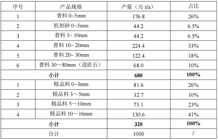項(xiàng)目以開采工程中開采出的礦石為原料,經(jīng)破碎、整形、二篩、棒磨等工序分選出各粒徑的普通骨料,經(jīng)破碎、整形、二篩、三篩等工序分選出各粒徑的骨料。