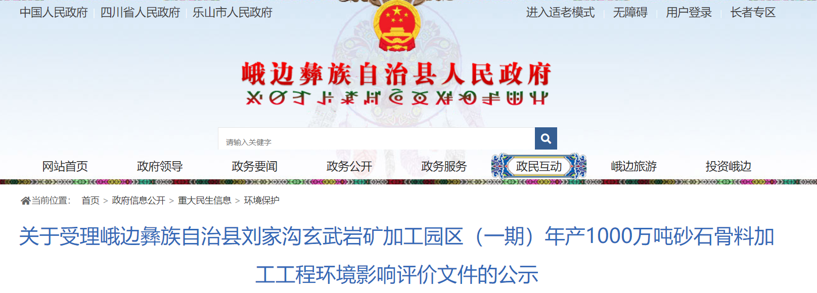 近日,四川樂山市峨邊生態(tài)環(huán)境局受理峨邊彝族自治縣劉家溝玄武巖礦加工園區(qū)(一期)年產(chǎn)1000萬(wàn)噸砂石骨料加工工程環(huán)境影響評(píng)價(jià)文件。