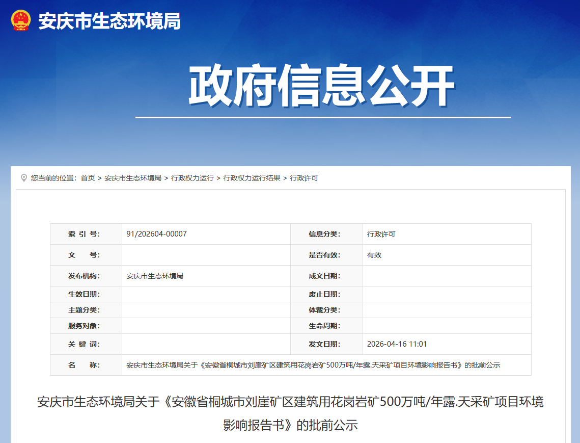 近日,安徽安慶市生態(tài)環(huán)境局發(fā)布《安徽省桐城市劉崖礦區(qū)建筑用花崗巖礦500萬噸/年露天采礦項目環(huán)境影響報告書》的批前公示,標(biāo)志著該重點礦產(chǎn)項目建設(shè)邁出關(guān)鍵一步。