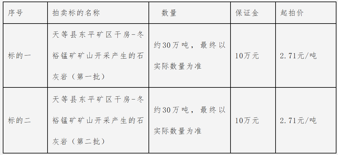 本次拍賣共推出兩批標的,均為天等縣東平礦區干房-冬裕錳礦礦山開采產生的石灰巖廢料,數量共計60萬噸(最終以實際數量為準),起拍價2.71元/噸。