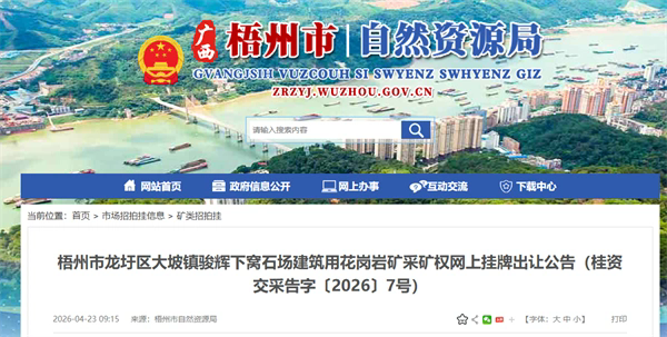 日前,廣西梧州市自然資源局發布龍圩區大坡鎮駿輝下窩石場建筑用花崗巖礦采礦權網上掛牌出讓公告。該項目資源儲量6084.89萬噸,生產規模300萬噸/年,出讓年限18年,掛牌起始價1.2億元,經估算單價1.97元/噸。
