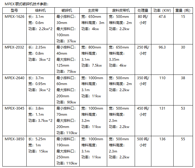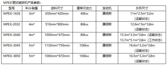 MPEX移動(dòng)顎式破碎機(jī)技術(shù)參數(shù):