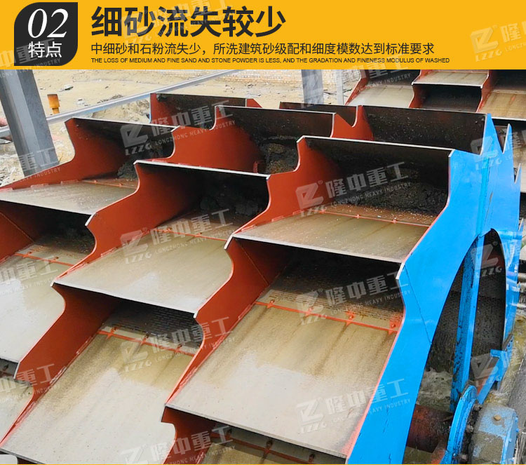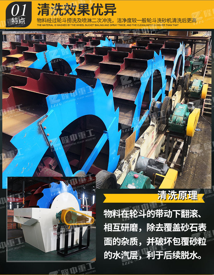 工作時,電機(jī)通過三角帶、減速機(jī)、齒輪減速后帶動葉輪緩慢轉(zhuǎn)動,砂石有給料槽進(jìn)入洗槽中,在葉輪的帶動下翻滾,并互相研磨,除去覆蓋砂石表面的雜質(zhì),同時破壞包覆砂粒的水汽層,以利于脫水;同時加水,形成強(qiáng)大水流,及時將雜質(zhì)及比重小的異物帶走,并從溢出口洗槽排出,完成清洗作用。干凈的砂石由葉片帶走,.后砂石從旋轉(zhuǎn)的葉輪倒入出料槽,完成砂石的清洗作用。