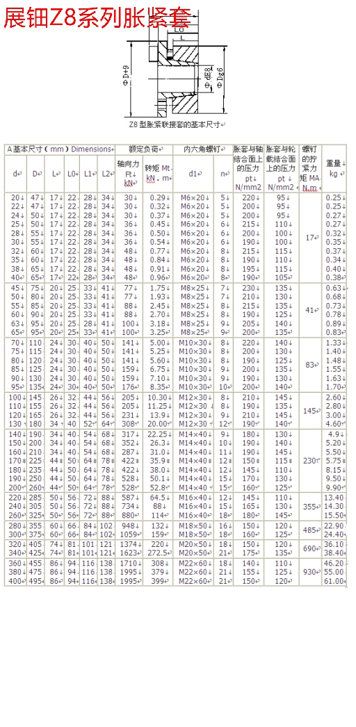 Z8型系列脹緊套型號如下:Z8-20×47Z8-22×47、Z8-24×50Z8-25×50、Z8-28×55Z8-30×55Z8-32×60、Z8-35×60Z8-38×65、Z8-40×65、Z8-45×75、Z8-50×80、Z8-55×85、Z8-60×90、Z8-63×95Z8-65×95、Z8-70×110Z8-75×115、Z8-80×120Z8-85×125、Z8-90×130、Z8-95×135Z8-100×145、Z8-110×155Z8-120×165、Z8-130×180、Z8-140×190、Z8-150×200、Z8-160×210Z8-170×225、Z8-180×235Z8-190×250、Z8-200×260、Z8-220×285、Z8-240×305Z8-260×325、Z8-280×355、Z8-300×375、Z8-320×405、Z8-340×425、Z8-360×455Z8-380×475、Z8-400×495。注:Z8型脹緊聯(lián)結(jié)套螺釘?shù)臋C械性能等級為12.9級。