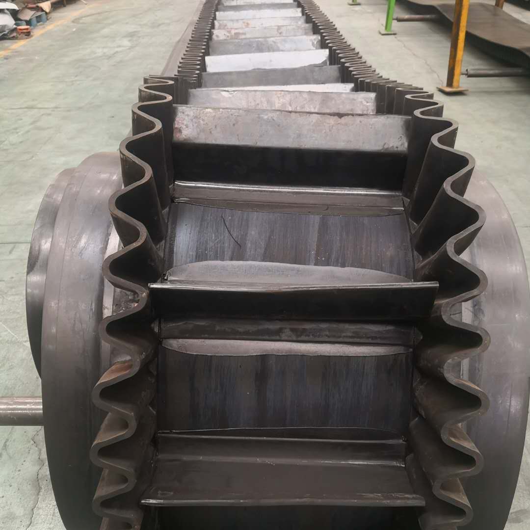 大傾角裙邊隔板帶, 是由基帶、擋邊、橫隔板3部分組成。擋邊起防止物料測(cè)滑撒落的作用。為便于繞過(guò)滾筒,檔邊設(shè)計(jì)成波紋狀;橫隔板的作用是承托物料,為了實(shí)現(xiàn)大傾角輸送,采用T型TC型。檔邊和橫隔板是用二次硫化的方法與基帶連接的,具有很高的連接強(qiáng)度。用于輸送易散落的粉狀、粒狀、小塊狀、糊狀及液態(tài)狀物料。其特點(diǎn):適用于傾角0°~90°散裝物料的輸送;具有使用范圍廣、占地面積小、無(wú)轉(zhuǎn)運(yùn)點(diǎn)、減少土建投資、維護(hù)費(fèi)用低、維修容易輸送量大連續(xù)化、高效率、大傾角運(yùn)輸,操作安全,使用簡(jiǎn)便,,運(yùn)費(fèi)低廉,并能縮短運(yùn)輸距離,降低工程造價(jià),節(jié)省人力物力等特點(diǎn);解決了普通帶和花紋帶所不能達(dá)到的輸送角度;還可根據(jù)使用環(huán)境,設(shè)計(jì)成完整、獨(dú)立的輸送系統(tǒng),避免了間斷輸送和復(fù)雜輸送的提升系統(tǒng)。可沿水平、傾斜、垂直和變角方向輸送各種散裝物料,從煤、礦石、沙子到化肥和糧食等。物料粒度不限,可從很小的粒度到400mm的大粒度,輸送量可從1立方米/小時(shí)到6000立方米/小時(shí)。