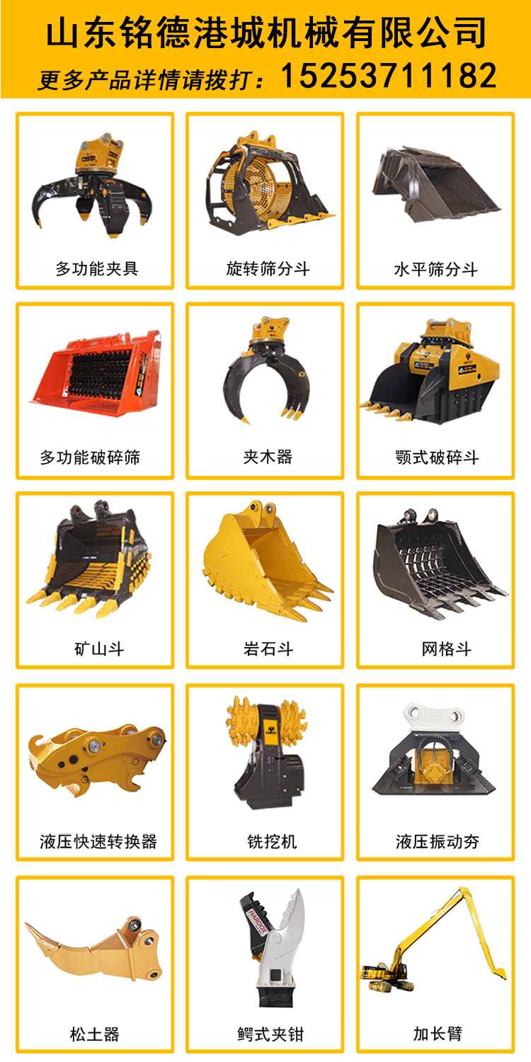 山東銘德機(jī)械有限公司主營(yíng)挖掘機(jī)挖斗,加長(zhǎng)臂,液壓夾具,破碎斗,液壓剪,振動(dòng)夯,破碎鉗,破碎錘,液壓拆房剪,松土器,夾木器、高頻破碎器、銑挖機(jī)、破碎篩分斗、大小臂、推土機(jī)推鏟、推土機(jī)松土器、裝載機(jī)鏟斗等,適用小松、日立、卡特、神鋼挖機(jī),公司產(chǎn)品可根據(jù)工程性質(zhì)定做,交付快。產(chǎn)品經(jīng)久耐用,公司質(zhì)量保證。應(yīng)用Robi是為篩選、分揀、混合和肥料堆制而特別設(shè)計(jì)的多功能破碎篩分斗。這樣使得客戶(hù)可以根據(jù)篩斗的較佳利用方案來(lái)選擇是安裝在挖掘機(jī)上還是裝載機(jī)上。通過(guò)土壤輪軸,MM破碎篩可以篩分不同的材料,包括表層土壤,沙子以及之下的部分。如果用上標(biāo)準(zhǔn)輪軸,那么MM破碎篩就能夠破碎易碎的煤塊、磚頭等等。還有一個(gè)更加特殊的應(yīng)用就是安裝泥煤(炭)輪軸后可以用來(lái)分揀和篩選泥煤(炭)及相關(guān)材料。