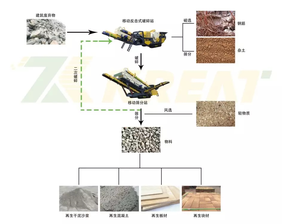 篩分:再分離輕物質(zhì)后根據(jù)粒徑大小通過(guò)篩分系統(tǒng)生成不同的建筑石料、砂料、木料等重新循環(huán)到生產(chǎn)中。