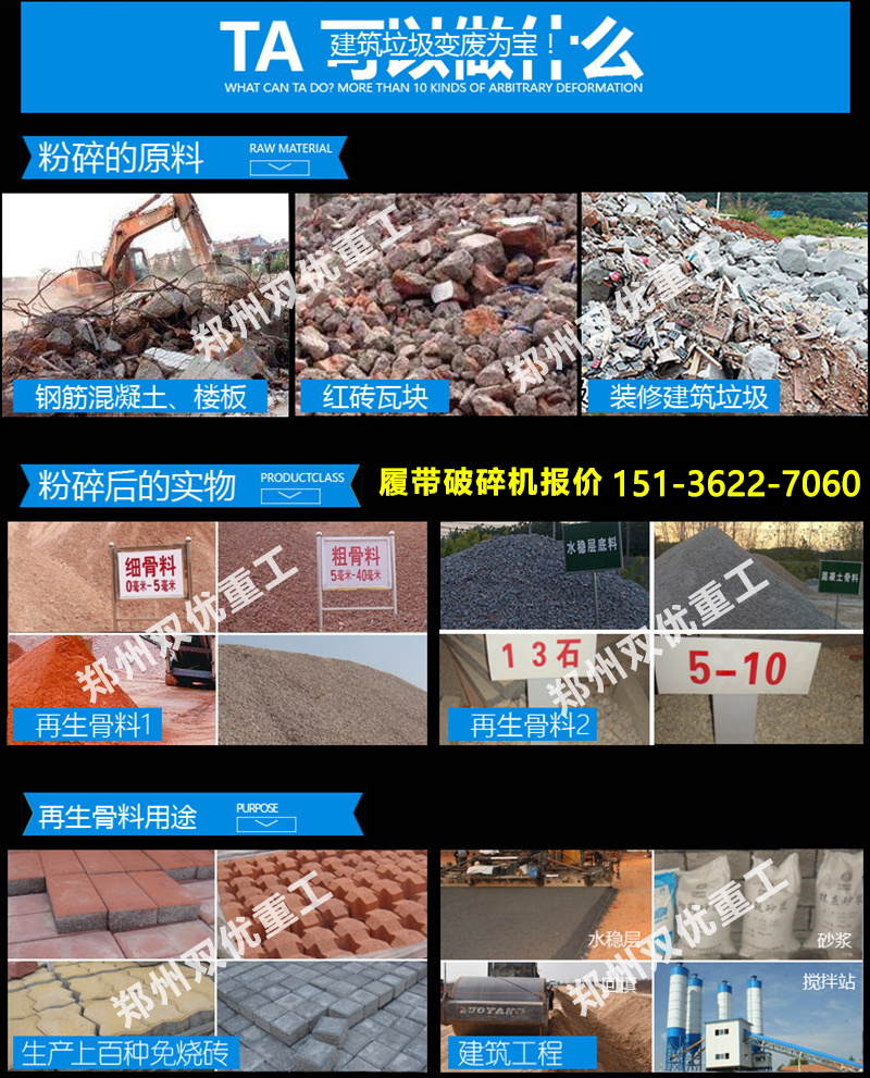 鄭州雙優(yōu)新型建筑垃圾粉碎設(shè)備結(jié)構(gòu)簡單,占地面積小,設(shè)備靈活、方便,機動性強,噪音小,灰塵少,污染小,適合城中村拆遷改造建設(shè)區(qū)內(nèi)生產(chǎn)作業(yè),目前已經(jīng)在廣東深圳、安徽合肥,福建福州等多個地方成功將建筑垃圾粉碎成各種骨料,破碎效果好,為當(dāng)?shù)氐沫h(huán)保帶來了很大的經(jīng)濟循環(huán)效應(yīng)。