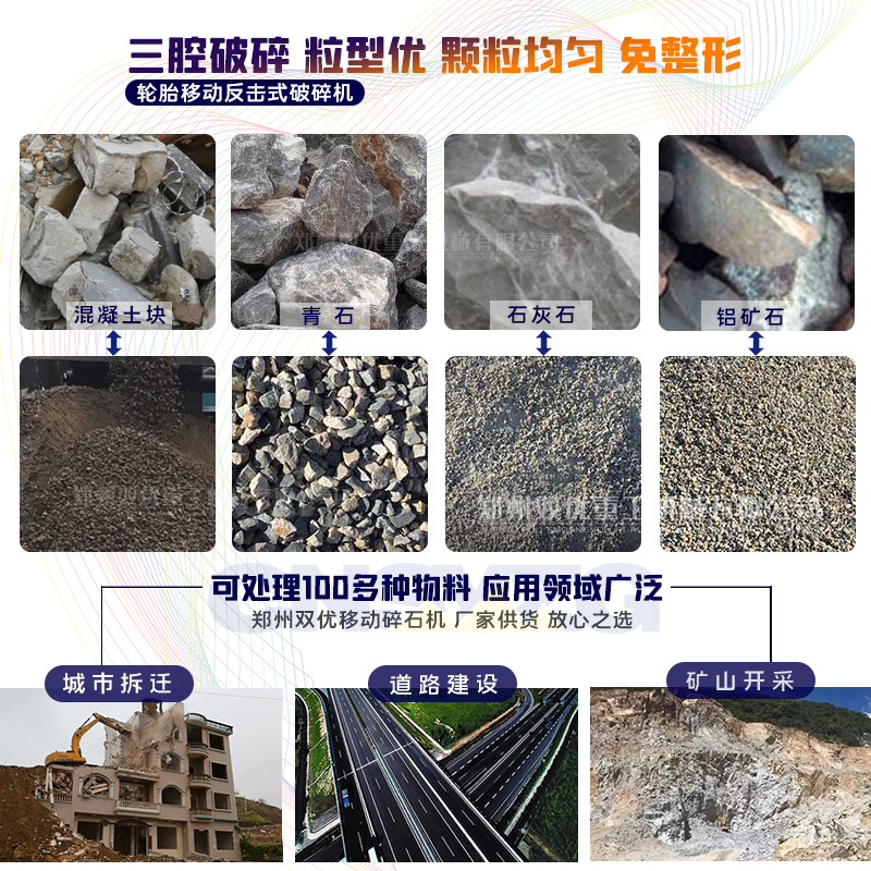 反擊破:進料粒度在500mm以下,主要用于軟物料的中細(xì)碎,針片狀少,成品粒型好看、粒度均勻;雖不能制砂,但出1213石子成品是沒有問題的,且可以直接出售;用戶可調(diào)整反擊式移動碎石機的反擊板與板錘間隙,控制出料粒度。