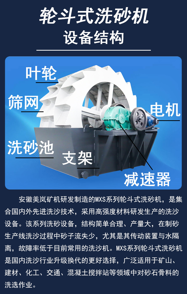 輪斗式洗砂機也稱作洗石機、輪斗洗砂機,是在制砂工藝中用于洗凈砂子中的混土、粉塵等,達到潔凈砂子的目的,亦可用于選礦等作業(yè)中的提砂或類似的工藝。美嵐礦機生產(chǎn)制造的MXS系列輪斗式洗砂機集合國內(nèi)外先進技術,采用高強度材料研發(fā)生產(chǎn)的洗沙設備。該系列產(chǎn)品,結(jié)構(gòu)簡單合理,產(chǎn)量大,在制砂生產(chǎn)線中洗沙過程砂子流失少,尤其是其傳動裝置與水隔離,故障率低于目前常用洗沙機。