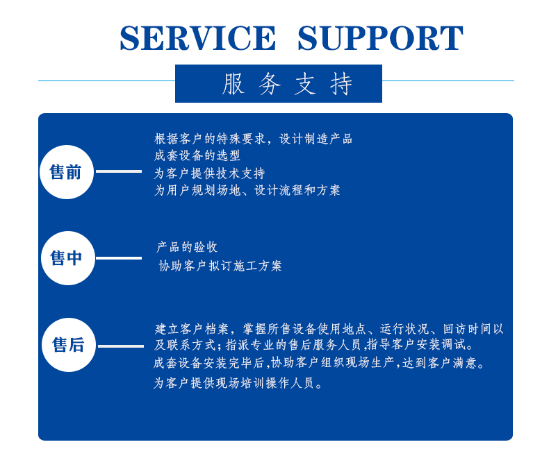 1.建立客戶檔案,掌握所售設(shè)備使用地點、運行狀況、回訪時間以及聯(lián)系方式;指派專業(yè)的售后服務(wù)人員,指導(dǎo)客戶安裝調(diào)試。成套設(shè)備安裝完畢后,協(xié)助客戶組織現(xiàn)場生產(chǎn),達(dá)到客戶滿意