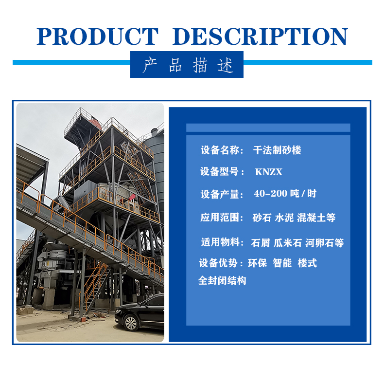 KNZX系列智能環(huán)保型干法樓式制砂系統(tǒng),在傳統(tǒng)干法制砂系統(tǒng)的基礎(chǔ)上進行了更新與升級,采用高度集約的樓式全封閉布置,集制砂系統(tǒng)、提升篩分系統(tǒng)、石粉控制系統(tǒng)、環(huán)保除塵系統(tǒng)、智能控制系統(tǒng)于一體,不但明顯提高了生產(chǎn)效率,更實現(xiàn)了機制砂粒型、級配、含粉量等各項指標(biāo)的提升,使機制砂的性能媲美天然砂,為砂石、水泥、混凝土產(chǎn)業(yè)鏈的發(fā)展創(chuàng)造新的機會和價值。