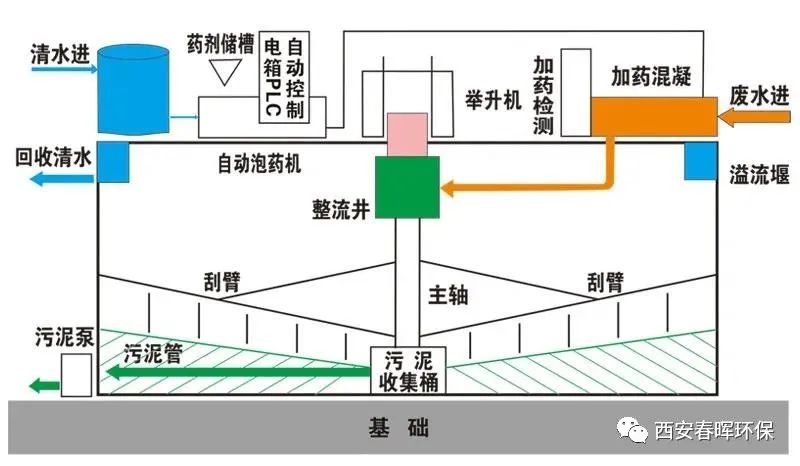 混凝槽;自動(dòng)加藥檢測系統(tǒng);舉升機(jī);自動(dòng)泡藥機(jī);清水桶;整流井、導(dǎo)流管;主軸;減速機(jī)、電機(jī);刮臂;污泥收集桶;污泥泵及管道;扭力彈簧;