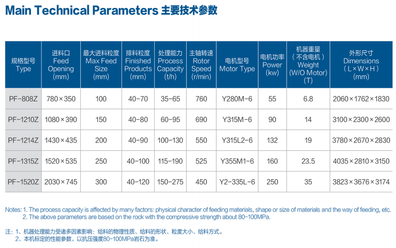 注:1、機(jī)器處理能力受諸多因素影響:給料的物理機(jī)械性質(zhì)、給料的形狀、粒度大小、給料方式。