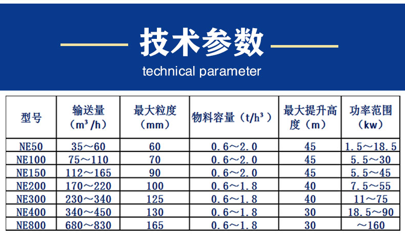 7.輸送能力大,該系列提升機(jī)具有NE50~NE800多種規(guī)格。提升量范圍為15~800m3/h。