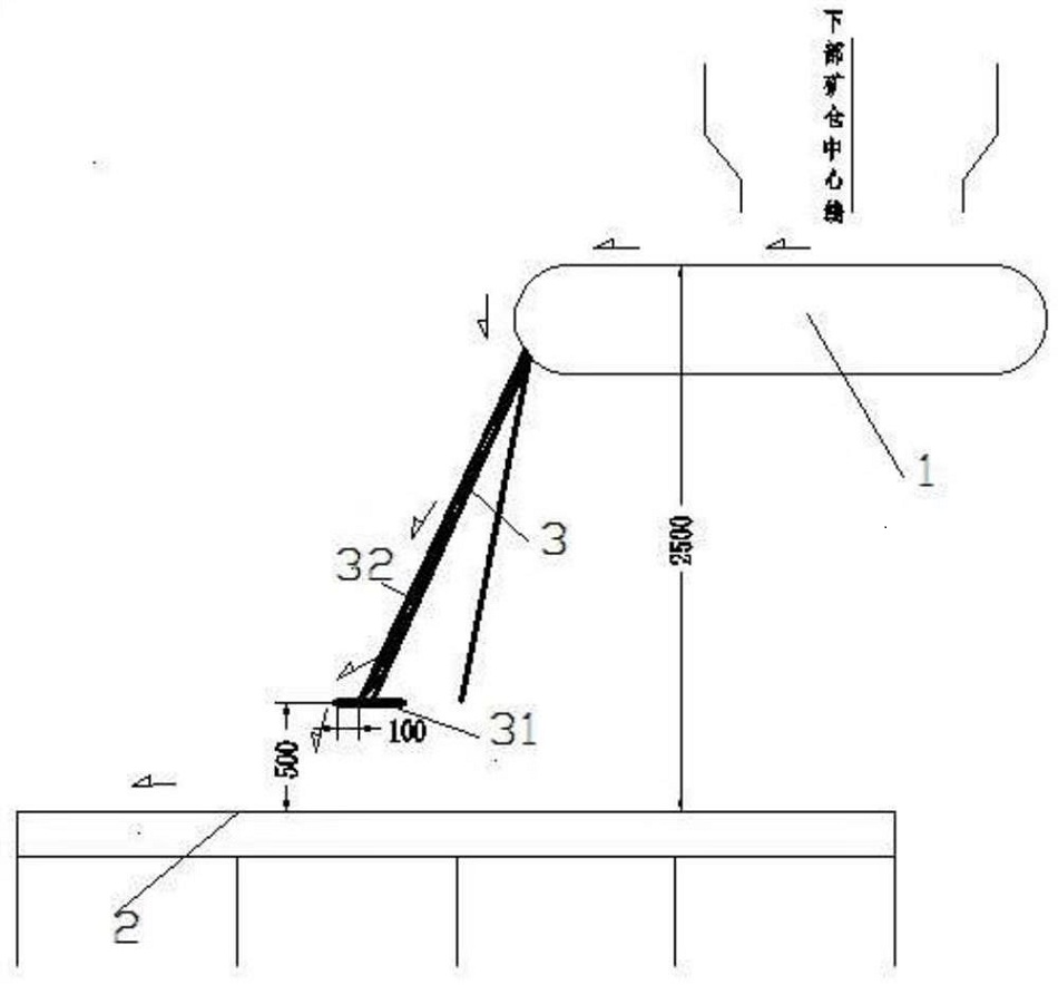 緩沖板31可以位于斜溜板3的出口的正下方,也可以位于相對斜溜板3的出口的正下方橫向偏移一定距離,只需使出口處的礦石能夠掉落至緩沖板31上即可。