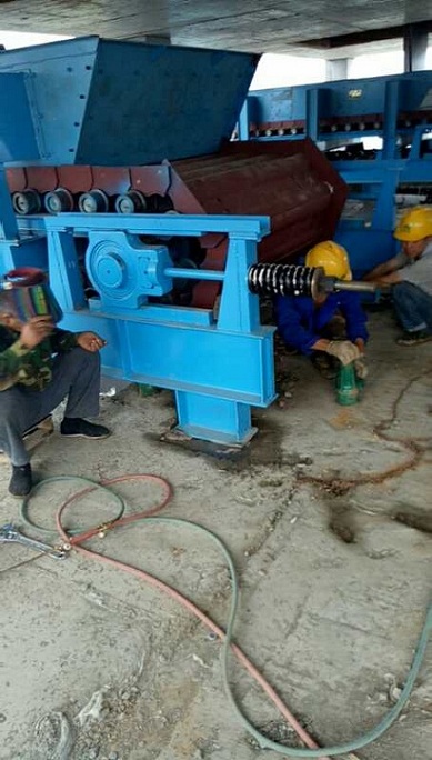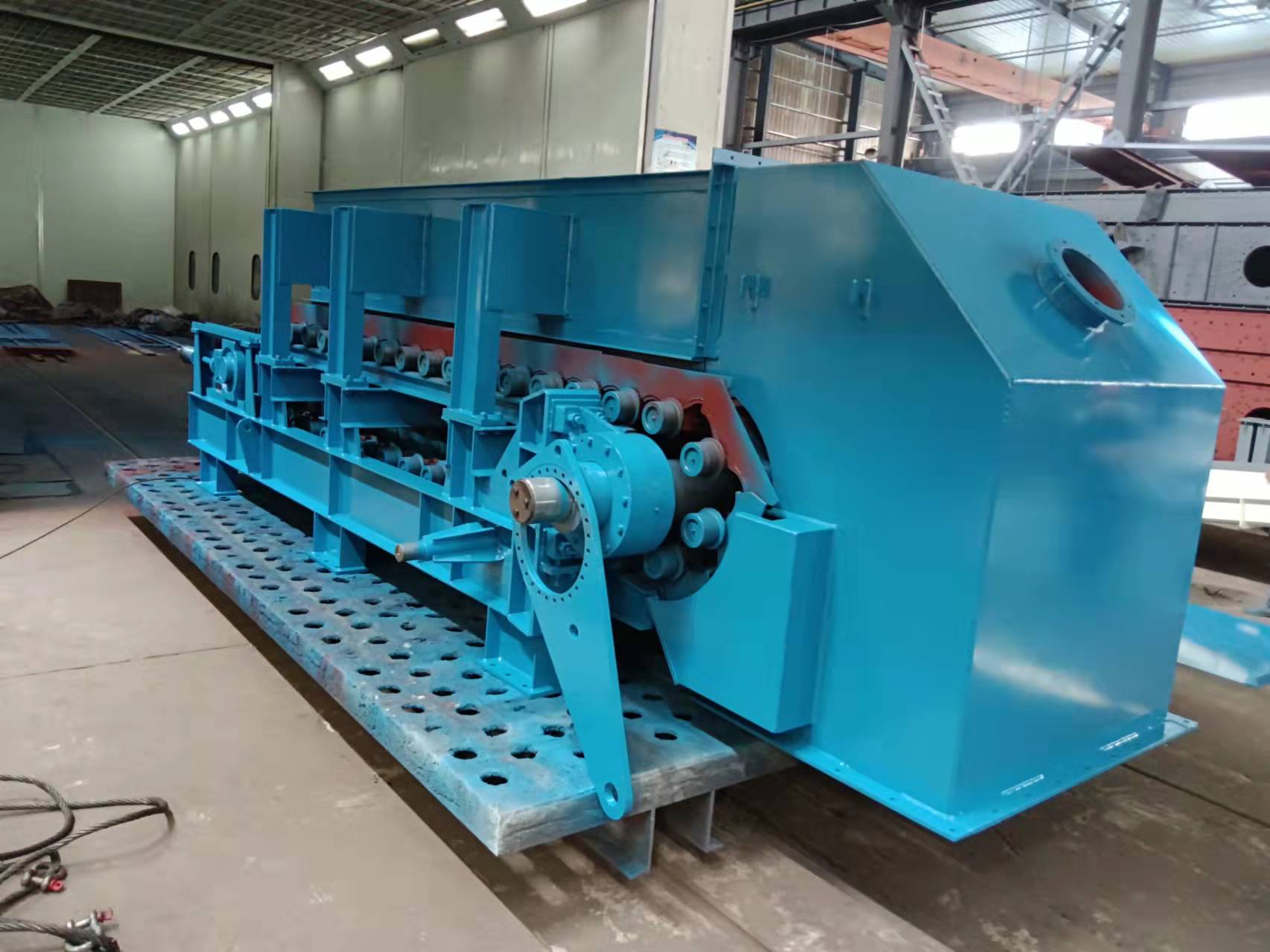 板式喂料機在給料過程中,礦石物料承載在鏈板上,鏈板底部會散落大量的粉礦積渣。為清理粉礦積渣,現有的板式給礦機通常設置有清理裝置,該清理裝置包括設置于鏈板下方的接料平臺,并使用電機及鏈條帶動刮板將接料平臺上的接粉積渣礦推向下料口,然而這種清理裝置存在以下問題:鏈條受力不均衡,尾部的鏈條拉緊裝置的軸承座容易斷裂;刮板活動鏈條易跳槽,且容易斷裂;刮條跨距大,且裝置尾部存在刮礦盲區,粉礦積渣造成刮板受擠壓變形,斷裂或相互纏繞,造成電機的非正常停機,導致清理裝置維修工作量大、維修成本高。