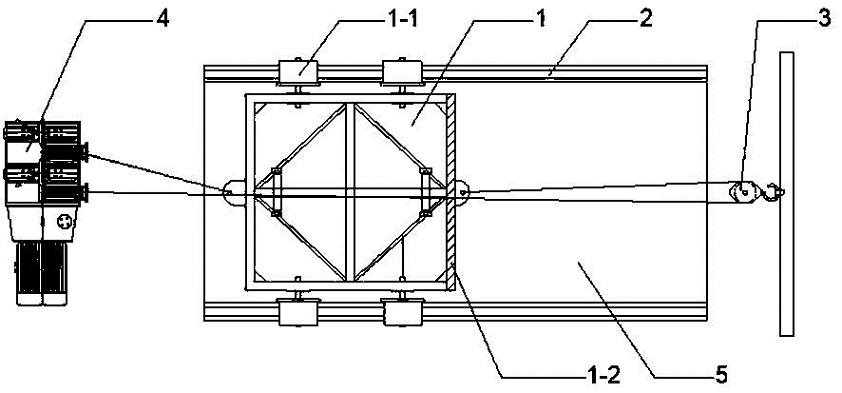板式喂料機粉礦清理裝置,安裝在重型板式給礦機底部,該裝置包括刮料小車1、軌道2、定滑輪3以及電耙絞車4:刮料小車1由平臺、軌道輪1-1及刮板1-2組成,軌道輪1-1設置于平臺左右兩側,頭尾兩側設置拉環;平臺頂部后側設置垂直于鏈板運動方向的刮板1-2;在鏈板下方的地面上沿鏈板運動方向鋪設軌道2,刮料小車1沿軌道2運行;在鏈板尾部下方的地面上設置定滑輪3;在鏈板頭部設置電耙絞車4,電耙絞車4內包含兩個鋼繩卷筒裝置,一卷筒裝置的鋼繩固定在刮料小車1頭部的拉環,第二卷筒裝置的鋼繩穿過定滑輪3滑道固定在刮料小車1尾部的拉環上。
