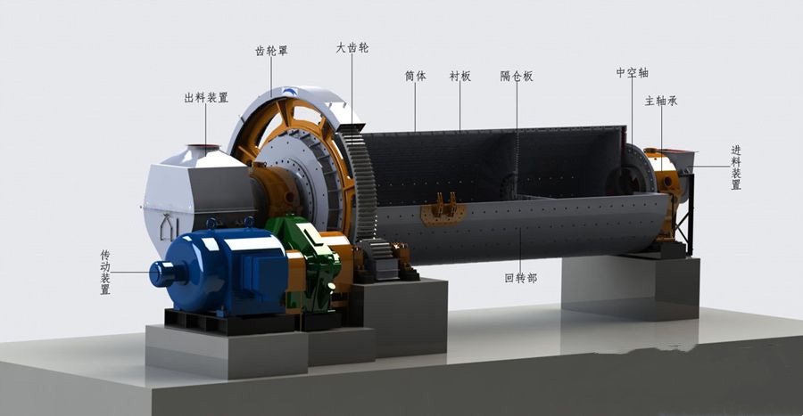 物料經(jīng)過給料部、進(jìn)料部進(jìn)入筒體部 。筒體部的磨礦介質(zhì)(鋼球/陶瓷球)會(huì)與物料隨筒體回轉(zhuǎn)產(chǎn)生離心力作用,當(dāng)介質(zhì)提升到一定高度后根據(jù)重力作用拋落下來,在磨礦介質(zhì)對物料的沖擊磨剝作用下將物料粉碎,粉碎后的物料借助進(jìn)料及沖礦水的推力經(jīng)出料口排出機(jī)外,從而完成整個(gè)磨礦過程。
