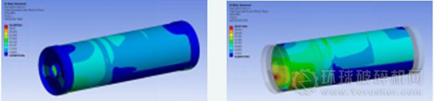 圖7 筒體應(yīng)力分布云圖 圖8 去掉進(jìn)、出口滑環(huán)的筒體應(yīng)力分布云圖