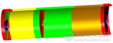 自重載荷指磨體結(jié)構(gòu)本身,襯板、隔倉板,相應(yīng)連接件等所有內(nèi)部裝置重量。我們把所有內(nèi)部裝置重量“揉進(jìn)結(jié)構(gòu)自重”,將與之相應(yīng)的總質(zhì)量除以結(jié)構(gòu)本身體積,得到包括所有內(nèi)部裝置在內(nèi)的結(jié)構(gòu)的“當(dāng)量密度”。并以這個“當(dāng)量密度”代替結(jié)構(gòu)材料原來實際密度,程序就可以自動處理這部分載荷了。目前相關(guān)文獻(xiàn)在處理此處問題時,都是用筒體的總質(zhì)量除以筒體結(jié)構(gòu)的總體積來計算當(dāng)量載荷,由于筒體各部分質(zhì)量并非均勻一致,因此,這樣計算會對結(jié)果的精度造成影響。