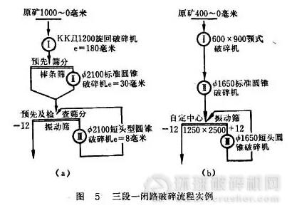 圖5(b)為某鉛鋅曠采用的第一段、第二段均不帶預(yù)先 篩分的三段一閉路破碎流程實例。