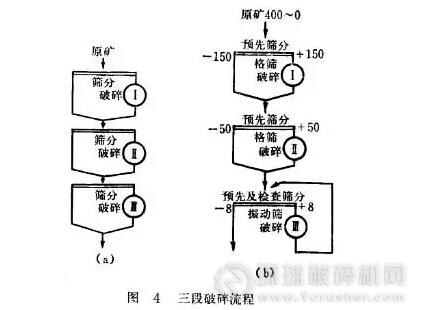 三段破碎流程是最常用的。可以分為兩種類型: