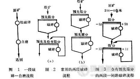 當(dāng)選廠生產(chǎn)規(guī)模不大,且第一段破碎機(jī)生產(chǎn)能力大大富余的情況下,則可以采用第一段不設(shè)預(yù)先篩分的兩段一閉路破碎流程。