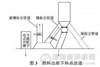 3)為保證良好的收塵效果和節(jié)約能耗,在每個收塵管上均安裝了蝶閥,對不運(yùn)行的點(diǎn)位進(jìn)行關(guān)閉。熟料出庫下料點(diǎn)改造見圖 3。