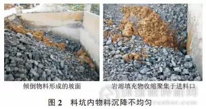 我們根據(jù)石灰石中的鈣含量,通常每車潔凈石灰石(約55t)按 1~2 鏟與巖溶填充物進(jìn)行拋撒搭配,搭配比例約在 6%。 破碎料坑容積約 300m3,但因運(yùn)礦車單側(cè)卸料,只能裝納 4 車物料,約 200t。 從現(xiàn)場觀察來看,破碎料坑上部為直段,下部呈倒喇叭口狀(錐形)。卸料后,料坑內(nèi)物料表層呈一定坡度(見圖 2)。由于料坑高度原因,當(dāng)料坑運(yùn)礦車卸料側(cè)物料與卸料口水平時(shí),料坑另一側(cè)物料剛好淹沒料坑下部(重型板式喂料機(jī)上方)進(jìn)料口。 此時(shí)搭配的巖溶填充物在料坑下部錐形口處隨著重型板式喂料機(jī)輸送而快速收縮聚集在一起,因此,未起到均勻沉降的效果(見圖 2)。隨著料坑下部進(jìn)料口露出,此種現(xiàn)象更為明顯。 當(dāng)集中的巖溶填充物輸送至破碎機(jī)內(nèi), 由于其黏性較強(qiáng)(沉積巖尤為突出),篦板間隙小,進(jìn)入破碎機(jī)后附著在篦板以及破碎機(jī)內(nèi)部,造成堵塞篦孔制約生產(chǎn)。因此,盡量使料坑內(nèi)物料充足,避免料坑下部進(jìn)料口露出,應(yīng)該采取一層潔凈石灰石與一層巖溶填充物的搭配方式,通過上部物料擠壓,沉降均勻,再通過重型板式喂料機(jī)輸送至破碎機(jī)內(nèi)才能起到最佳均化效果,破碎機(jī)工況將會(huì)大大提升。