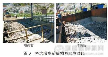 1)對(duì)進(jìn)料坑進(jìn)行擴(kuò)容處理,將料坑整體升高1.5m。增高后料坑容積從原來的 300m?增加至 420m?,能多卸料 3 車,使?jié)崈羰沂c巖溶填充物能充分沉降混合。料坑增高前后對(duì)比見圖 3。