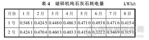 3)1 號(hào)和 2 號(hào)破碎機(jī)噸石灰石耗電量在料坑增高以后均呈下降趨勢,2 號(hào)破碎機(jī)尤為明顯,見表 4。