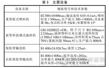錘式破碎機(jī)內(nèi),再由短膠帶輸送機(jī)將破碎后的物料轉(zhuǎn)送到長距離膠帶輸送機(jī)。工藝流程和主要設(shè)備見圖 1 和表 1。